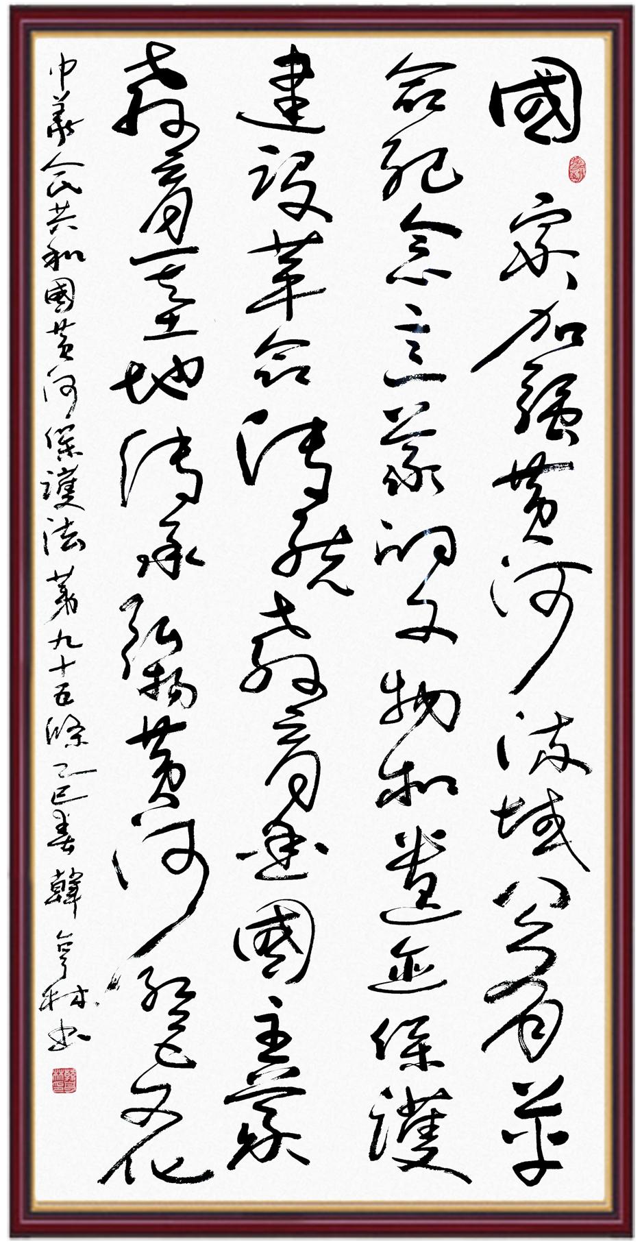 黃河寧,天下平。黃河是中華民族的發(fā)源地和搖籃,保護(hù)黃河是事關(guān)中華民族偉大復(fù)興的千秋大計(jì)。《中華人民共和國(guó)黃河保護(hù)法》為推進(jìn)水資源節(jié)約集約利用、保護(hù)傳承弘揚(yáng)黃河文化、推動(dòng)黃河流域生態(tài)保護(hù)和高質(zhì)量發(fā)展提供了有力法治保障。繼書寫《中華人民共和國(guó)民法典》《中華人民共和國(guó)憲法》《中華人民共和國(guó)澳門特別行政區(qū)基本法》《中華人民共和國(guó)香港特別行政區(qū)基本法》《中華人民共和國(guó)國(guó)旗法》《中華人民共和國(guó)國(guó)徽法》《中華人民共和國(guó)國(guó)歌法》《中華人民共和國(guó)法官法》等法律法規(guī)之后,法制日?qǐng)?bào)社聯(lián)合沿黃九?。▍^(qū))司法廳、書法家協(xié)會(huì),將筆端對(duì)準(zhǔn)《中華人民共和國(guó)黃河保護(hù)法》。