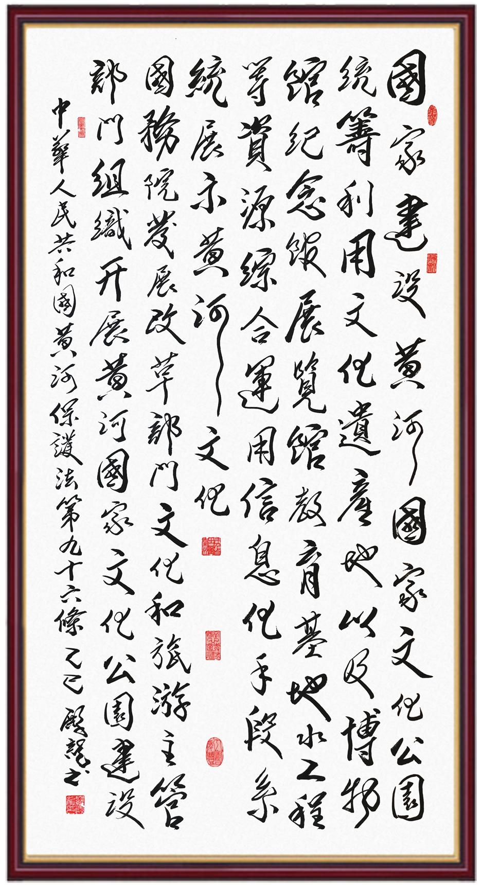 黃河寧,天下平。黃河是中華民族的發(fā)源地和搖籃,保護黃河是事關(guān)中華民族偉大復興的千秋大計?!吨腥A人民共和國黃河保護法》為推進水資源節(jié)約集約利用、保護傳承弘揚黃河文化、推動黃河流域生態(tài)保護和高質(zhì)量發(fā)展提供了有力法治保障。繼書寫《中華人民共和國民法典》《中華人民共和國憲法》《中華人民共和國澳門特別行政區(qū)基本法》《中華人民共和國香港特別行政區(qū)基本法》《中華人民共和國國旗法》《中華人民共和國國徽法》《中華人民共和國國歌法》《中華人民共和國法官法》等法律法規(guī)之后,法制日報社聯(lián)合沿黃九?。▍^(qū))司法廳、書法家協(xié)會,將筆端對準《中華人民共和國黃河保護法》。