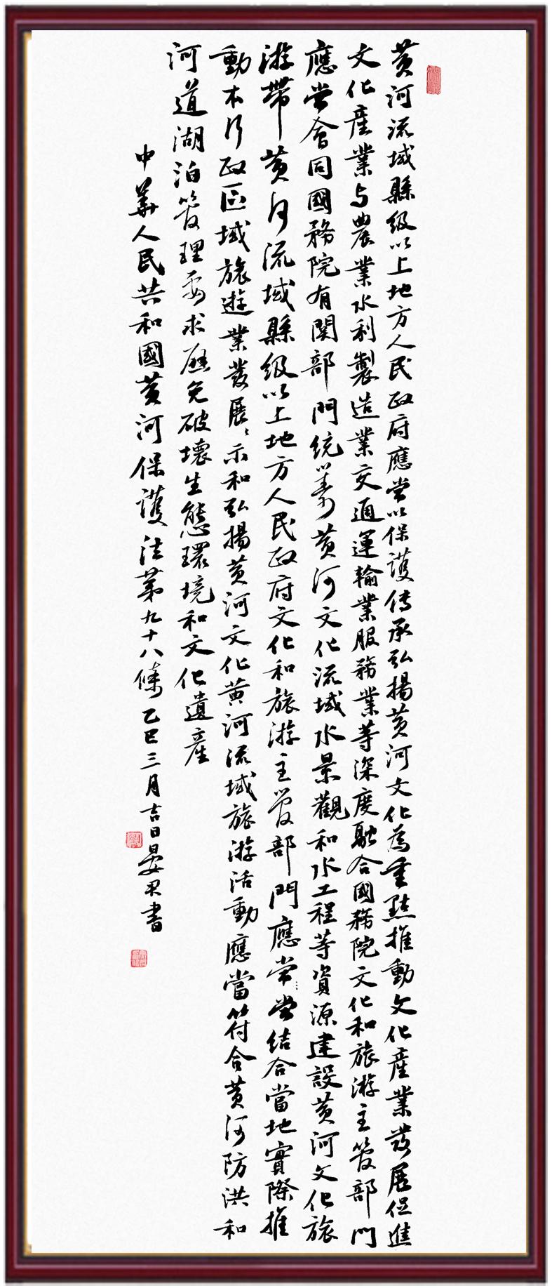 黃河寧,天下平。黃河是中華民族的發(fā)源地和搖籃,保護黃河是事關(guān)中華民族偉大復(fù)興的千秋大計?!吨腥A人民共和國黃河保護法》為推進水資源節(jié)約集約利用、保護傳承弘揚黃河文化、推動黃河流域生態(tài)保護和高質(zhì)量發(fā)展提供了有力法治保障。繼書寫《中華人民共和國民法典》《中華人民共和國憲法》《中華人民共和國澳門特別行政區(qū)基本法》《中華人民共和國香港特別行政區(qū)基本法》《中華人民共和國國旗法》《中華人民共和國國徽法》《中華人民共和國國歌法》《中華人民共和國法官法》等法律法規(guī)之后,法制日報社聯(lián)合沿黃九?。▍^(qū))司法廳、書法家協(xié)會,將筆端對準(zhǔn)《中華人民共和國黃河保護法》。