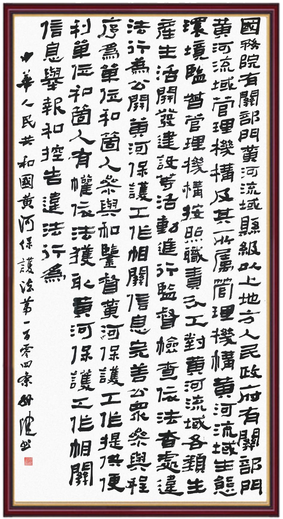 黃河寧,天下平。黃河是中華民族的發(fā)源地和搖籃,保護(hù)黃河是事關(guān)中華民族偉大復(fù)興的千秋大計(jì)?!吨腥A人民共和國黃河保護(hù)法》為推進(jìn)水資源節(jié)約集約利用、保護(hù)傳承弘揚(yáng)黃河文化、推動黃河流域生態(tài)保護(hù)和高質(zhì)量發(fā)展提供了有力法治保障。繼書寫《中華人民共和國民法典》《中華人民共和國憲法》《中華人民共和國澳門特別行政區(qū)基本法》《中華人民共和國香港特別行政區(qū)基本法》《中華人民共和國國旗法》《中華人民共和國國徽法》《中華人民共和國國歌法》《中華人民共和國法官法》等法律法規(guī)之后,法制日報(bào)社聯(lián)合沿黃九?。▍^(qū))司法廳、書法家協(xié)會,將筆端對準(zhǔn)《中華人民共和國黃河保護(hù)法》。
