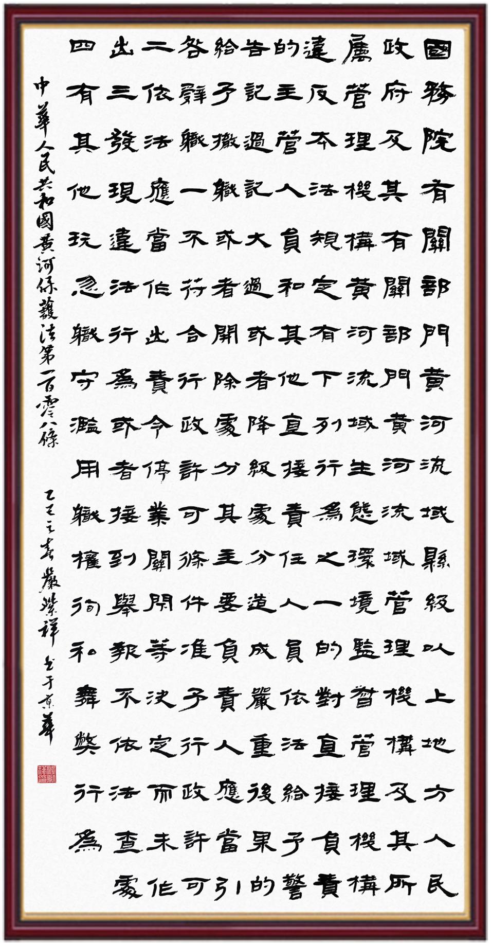 黃河寧,天下平。黃河是中華民族的發(fā)源地和搖籃,保護(hù)黃河是事關(guān)中華民族偉大復(fù)興的千秋大計。《中華人民共和國黃河保護(hù)法》為推進(jìn)水資源節(jié)約集約利用、保護(hù)傳承弘揚(yáng)黃河文化、推動黃河流域生態(tài)保護(hù)和高質(zhì)量發(fā)展提供了有力法治保障。繼書寫《中華人民共和國民法典》《中華人民共和國憲法》《中華人民共和國澳門特別行政區(qū)基本法》《中華人民共和國香港特別行政區(qū)基本法》《中華人民共和國國旗法》《中華人民共和國國徽法》《中華人民共和國國歌法》《中華人民共和國法官法》等法律法規(guī)之后,法制日報社聯(lián)合沿黃九?。▍^(qū))司法廳、書法家協(xié)會,將筆端對準(zhǔn)《中華人民共和國黃河保護(hù)法》。