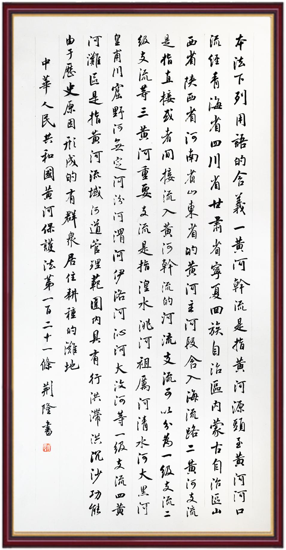 黃河寧,天下平。黃河是中華民族的發(fā)源地和搖籃,保護(hù)黃河是事關(guān)中華民族偉大復(fù)興的千秋大計。《中華人民共和國黃河保護(hù)法》為推進(jìn)水資源節(jié)約集約利用、保護(hù)傳承弘揚(yáng)黃河文化、推動黃河流域生態(tài)保護(hù)和高質(zhì)量發(fā)展提供了有力法治保障。繼書寫《中華人民共和國民法典》《中華人民共和國憲法》《中華人民共和國澳門特別行政區(qū)基本法》《中華人民共和國香港特別行政區(qū)基本法》《中華人民共和國國旗法》《中華人民共和國國徽法》《中華人民共和國國歌法》《中華人民共和國法官法》等法律法規(guī)之后,法制日報社聯(lián)合沿黃九省(區(qū))司法廳、書法家協(xié)會,將筆端對準(zhǔn)《中華人民共和國黃河保護(hù)法》。