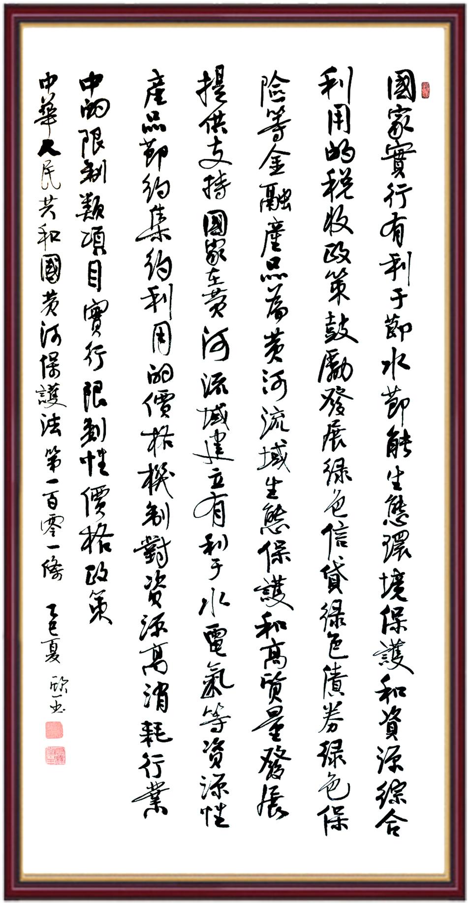 黃河寧,天下平。黃河是中華民族的發(fā)源地和搖籃,保護(hù)黃河是事關(guān)中華民族偉大復(fù)興的千秋大計(jì)?!吨腥A人民共和國黃河保護(hù)法》為推進(jìn)水資源節(jié)約集約利用、保護(hù)傳承弘揚(yáng)黃河文化、推動(dòng)黃河流域生態(tài)保護(hù)和高質(zhì)量發(fā)展提供了有力法治保障。繼書寫《中華人民共和國民法典》《中華人民共和國憲法》《中華人民共和國澳門特別行政區(qū)基本法》《中華人民共和國香港特別行政區(qū)基本法》《中華人民共和國國旗法》《中華人民共和國國徽法》《中華人民共和國國歌法》《中華人民共和國法官法》等法律法規(guī)之后,法制日?qǐng)?bào)社聯(lián)合沿黃九?。▍^(qū))司法廳、書法家協(xié)會(huì),將筆端對(duì)準(zhǔn)《中華人民共和國黃河保護(hù)法》。