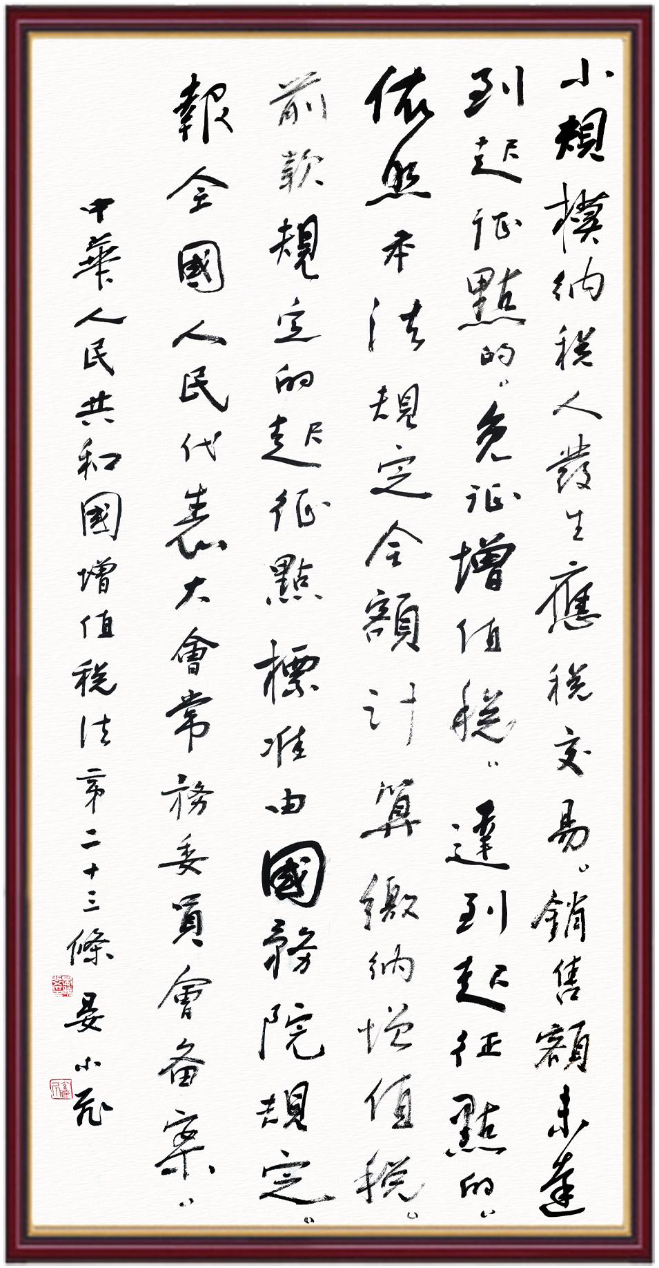 稅收一頭連著國(guó)計(jì),一頭連著民生。全面推進(jìn)依法治稅,是全面依法治國(guó)基本方略在稅收領(lǐng)域的集中體現(xiàn)。《中華人民共和國(guó)增值稅法》將于2026年1月1日起施行,對(duì)全面落實(shí)稅收法定原則、健全有利于高質(zhì)量發(fā)展的增值稅制度、規(guī)范增值稅的征收和繳納、保護(hù)納稅人合法權(quán)益具有重要意義。繼書(shū)寫(xiě)《中華人民共和國(guó)民法典》《中華人民共和國(guó)憲法》《中華人民共和國(guó)國(guó)旗法》《中華人民共和國(guó)國(guó)徽法》《中華人民共和國(guó)國(guó)歌法》《中華人民共和國(guó)法官法》《中華人民共和國(guó)黃河保護(hù)法》等法律法規(guī)之后,法制日?qǐng)?bào)社將筆端對(duì)準(zhǔn)《中華人民共和國(guó)增值稅法》。