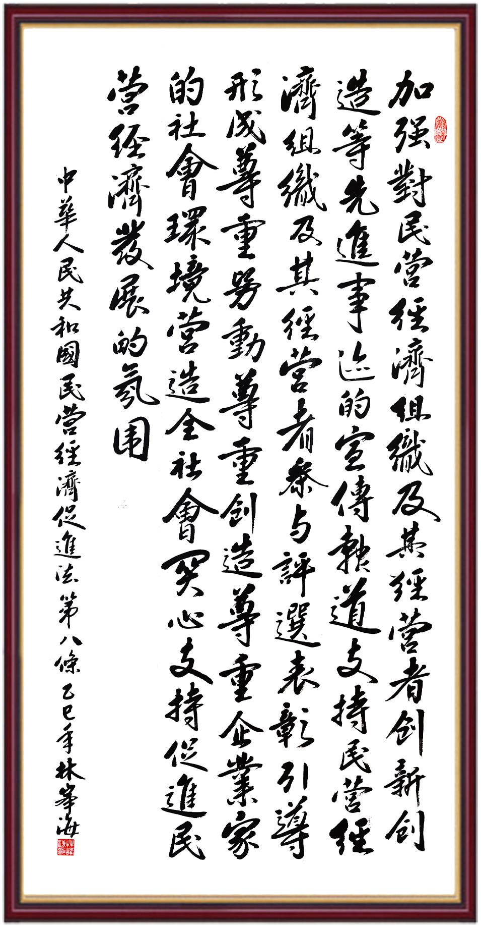 《中華人民共和國民營經(jīng)濟促進法》自今年5月20日起施行。作為我國首部專門關(guān)于民營經(jīng)濟發(fā)展的基礎(chǔ)性法律,民營經(jīng)濟促進法將支持和保障民營經(jīng)濟發(fā)展的法律制度融入中國特色社會主義法律體系,具有重大的法治意義,為促進民營經(jīng)濟持續(xù)、健康、高質(zhì)量發(fā)展提供了堅實的法治保障。為更好地學習、宣傳、貫徹這部法律,法治日報社聯(lián)合司法部普法與依法治理局,開展“‘書·法’系列活動之書寫《中華人民共和國民營經(jīng)濟促進法》”活動。