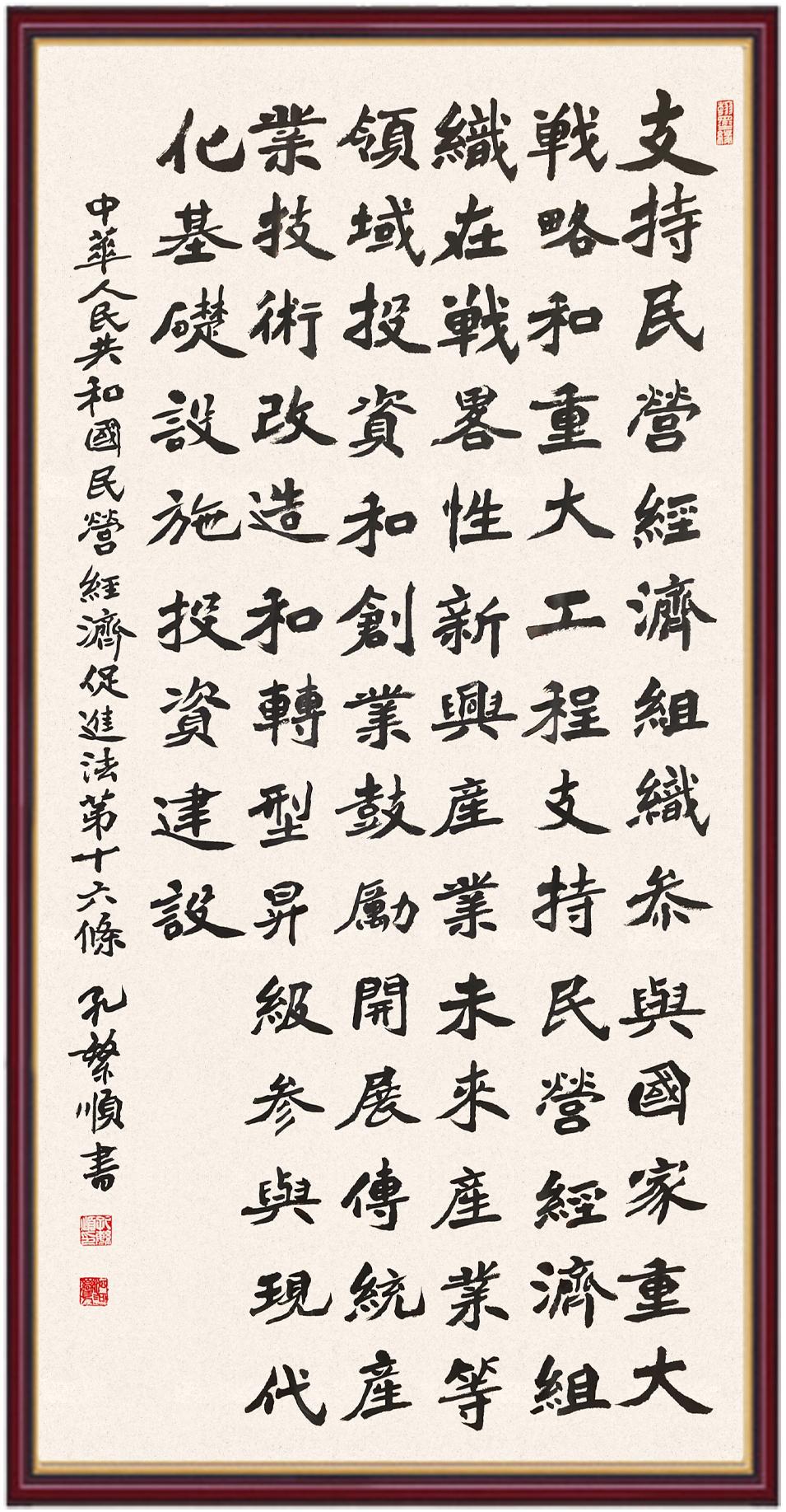《中華人民共和國民營經(jīng)濟促進(jìn)法》自今年5月20日起施行。作為我國首部專門關(guān)于民營經(jīng)濟發(fā)展的基礎(chǔ)性法律,民營經(jīng)濟促進(jìn)法將支持和保障民營經(jīng)濟發(fā)展的法律制度融入中國特色社會主義法律體系,具有重大的法治意義,為促進(jìn)民營經(jīng)濟持續(xù)、健康、高質(zhì)量發(fā)展提供了堅實的法治保障。為更好地學(xué)習(xí)、宣傳、貫徹這部法律,法治日報社聯(lián)合司法部普法與依法治理局,開展“‘書·法’系列活動之書寫《中華人民共和國民營經(jīng)濟促進(jìn)法》”活動。