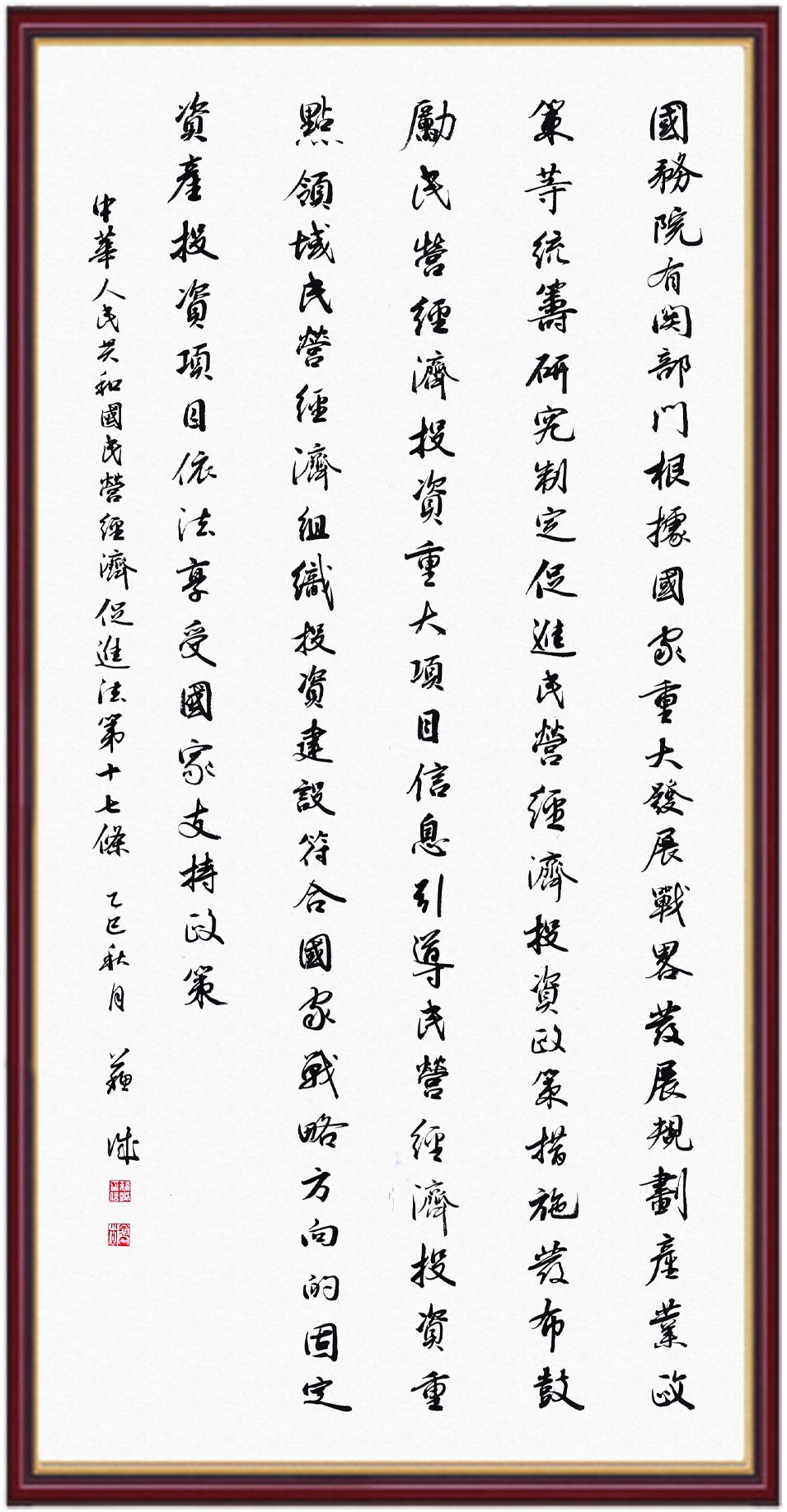 《中華人民共和國(guó)民營(yíng)經(jīng)濟(jì)促進(jìn)法》自今年5月20日起施行。作為我國(guó)首部專門(mén)關(guān)于民營(yíng)經(jīng)濟(jì)發(fā)展的基礎(chǔ)性法律,民營(yíng)經(jīng)濟(jì)促進(jìn)法將支持和保障民營(yíng)經(jīng)濟(jì)發(fā)展的法律制度融入中國(guó)特色社會(huì)主義法律體系,具有重大的法治意義,為促進(jìn)民營(yíng)經(jīng)濟(jì)持續(xù)、健康、高質(zhì)量發(fā)展提供了堅(jiān)實(shí)的法治保障。為更好地學(xué)習(xí)、宣傳、貫徹這部法律,法治日?qǐng)?bào)社聯(lián)合司法部普法與依法治理局,開(kāi)展“‘書(shū)·法’系列活動(dòng)之書(shū)寫(xiě)《中華人民共和國(guó)民營(yíng)經(jīng)濟(jì)促進(jìn)法》”活動(dòng)。