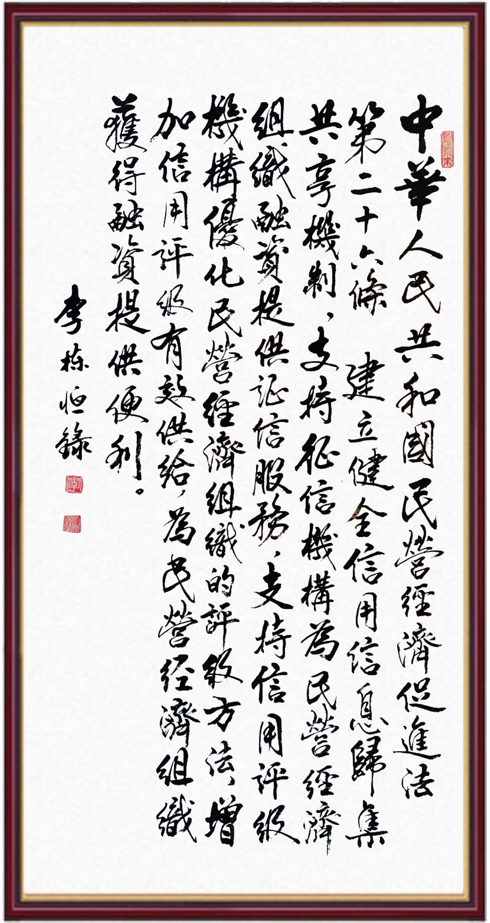《中華人民共和國民營經濟促進法》自今年5月20日起施行。作為我國首部專門關于民營經濟發(fā)展的基礎性法律,民營經濟促進法將支持和保障民營經濟發(fā)展的法律制度融入中國特色社會主義法律體系,具有重大的法治意義,為促進民營經濟持續(xù)、健康、高質量發(fā)展提供了堅實的法治保障。為更好地學習、宣傳、貫徹這部法律,法治日報社聯(lián)合司法部普法與依法治理局,開展“‘書·法’系列活動之書寫《中華人民共和國民營經濟促進法》”活動。