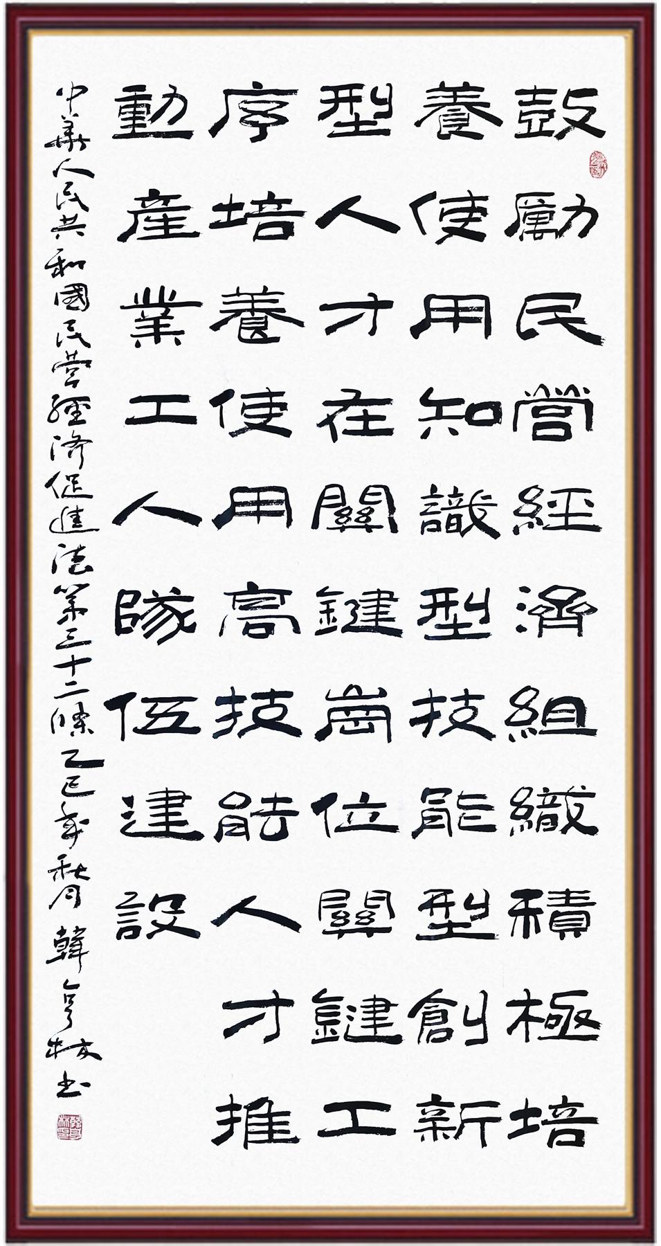 《中華人民共和國(guó)民營(yíng)經(jīng)濟(jì)促進(jìn)法》自今年5月20日起施行。作為我國(guó)首部專門關(guān)于民營(yíng)經(jīng)濟(jì)發(fā)展的基礎(chǔ)性法律,民營(yíng)經(jīng)濟(jì)促進(jìn)法將支持和保障民營(yíng)經(jīng)濟(jì)發(fā)展的法律制度融入中國(guó)特色社會(huì)主義法律體系,具有重大的法治意義,為促進(jìn)民營(yíng)經(jīng)濟(jì)持續(xù)、健康、高質(zhì)量發(fā)展提供了堅(jiān)實(shí)的法治保障。為更好地學(xué)習(xí)、宣傳、貫徹這部法律,法治日?qǐng)?bào)社聯(lián)合司法部普法與依法治理局,開(kāi)展“‘書·法’系列活動(dòng)之書寫《中華人民共和國(guó)民營(yíng)經(jīng)濟(jì)促進(jìn)法》”活動(dòng)。