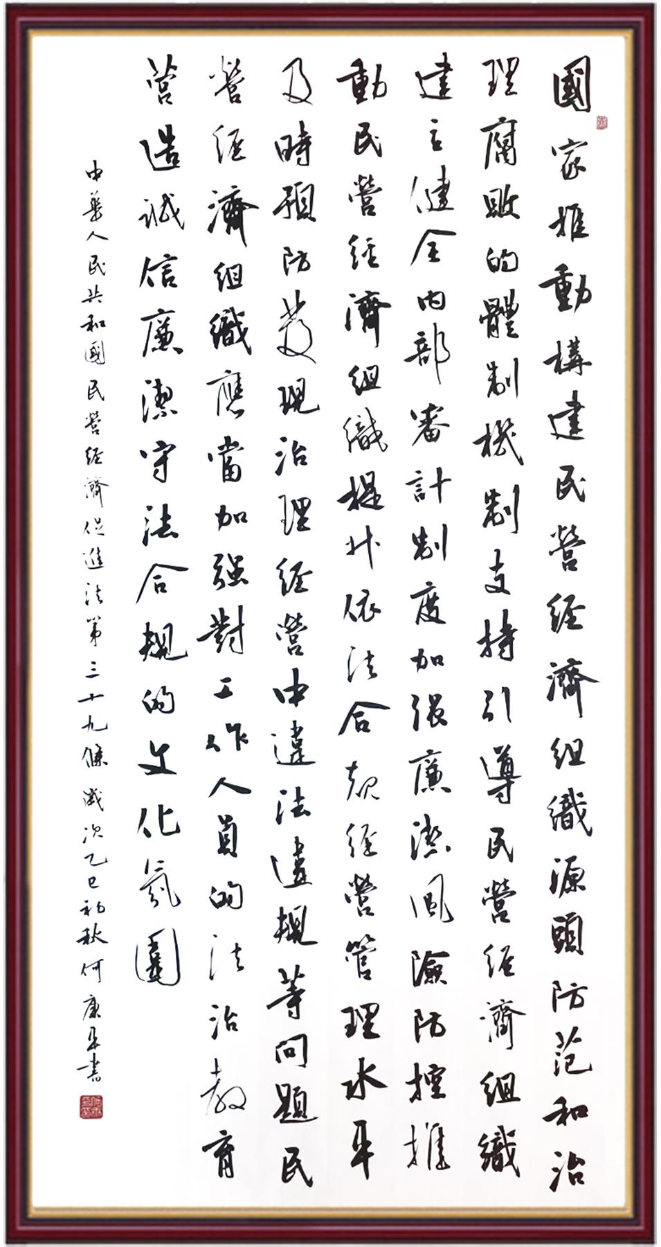 《中華人民共和國(guó)民營(yíng)經(jīng)濟(jì)促進(jìn)法》自今年5月20日起施行。作為我國(guó)首部專(zhuān)門(mén)關(guān)于民營(yíng)經(jīng)濟(jì)發(fā)展的基礎(chǔ)性法律,民營(yíng)經(jīng)濟(jì)促進(jìn)法將支持和保障民營(yíng)經(jīng)濟(jì)發(fā)展的法律制度融入中國(guó)特色社會(huì)主義法律體系,具有重大的法治意義,為促進(jìn)民營(yíng)經(jīng)濟(jì)持續(xù)、健康、高質(zhì)量發(fā)展提供了堅(jiān)實(shí)的法治保障。為更好地學(xué)習(xí)、宣傳、貫徹這部法律,法治日?qǐng)?bào)社聯(lián)合司法部普法與依法治理局,開(kāi)展“‘書(shū)·法’系列活動(dòng)之書(shū)寫(xiě)《中華人民共和國(guó)民營(yíng)經(jīng)濟(jì)促進(jìn)法》”活動(dòng)。