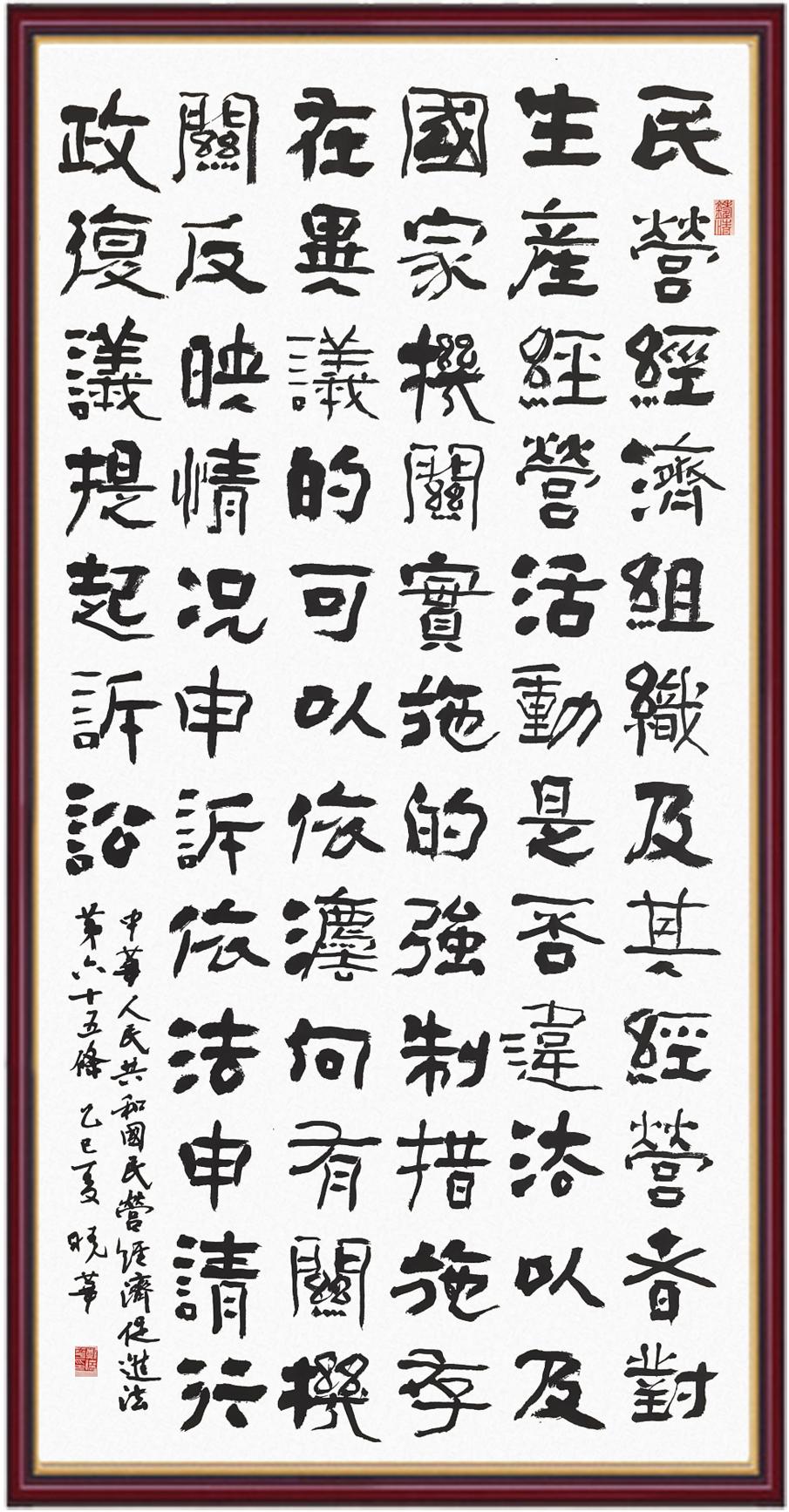 《中華人民共和國民營經(jīng)濟(jì)促進(jìn)法》自今年5月20日起施行。作為我國首部專門關(guān)于民營經(jīng)濟(jì)發(fā)展的基礎(chǔ)性法律,民營經(jīng)濟(jì)促進(jìn)法將支持和保障民營經(jīng)濟(jì)發(fā)展的法律制度融入中國特色社會主義法律體系,具有重大的法治意義,為促進(jìn)民營經(jīng)濟(jì)持續(xù)、健康、高質(zhì)量發(fā)展提供了堅實的法治保障。為更好地學(xué)習(xí)、宣傳、貫徹這部法律,法治日報社聯(lián)合司法部普法與依法治理局,開展“‘書·法’系列活動之書寫《中華人民共和國民營經(jīng)濟(jì)促進(jìn)法》”活動。