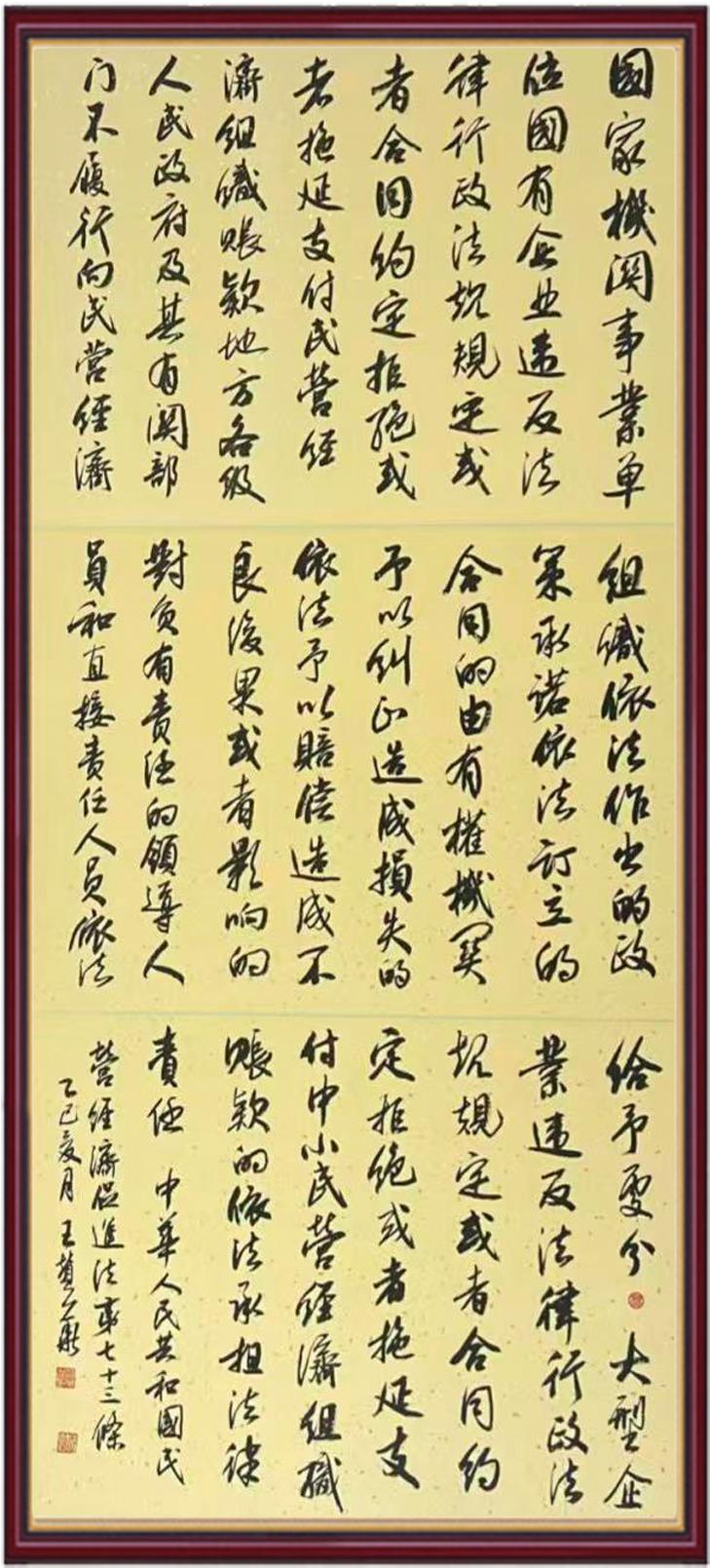 2020年7月11日,由法治日報(bào)社主辦、法報(bào)文化傳媒(北京)有限公司和北京千音文化傳媒有限公司聯(lián)合承辦的“書·法”系列活動正式啟動。“書·法”活動旨在為創(chuàng)新法治宣傳教育,多開一點(diǎn)腦洞、多花一點(diǎn)心思、多出一點(diǎn)力量、多作一點(diǎn)貢獻(xiàn),引領(lǐng)和推動更多的人拿起筆來學(xué)法、寫法,在不斷“書·法”過程中,提升自身的法治素養(yǎng),在全社會弘揚(yáng)法治精神。先后書寫《中華人民共和國民法典》《中華人民共和國憲法》《中華人民共和國澳門特別行政區(qū)基本法》《中華人民共和國香港特別行政區(qū)基本法》《中華人民共和國國旗法》《中華人民共和國國徽法》《中華人民共和國國歌法》《中華人民共和國法官法》《中華人民共和國黃河保護(hù)法》等19部法律法規(guī)。