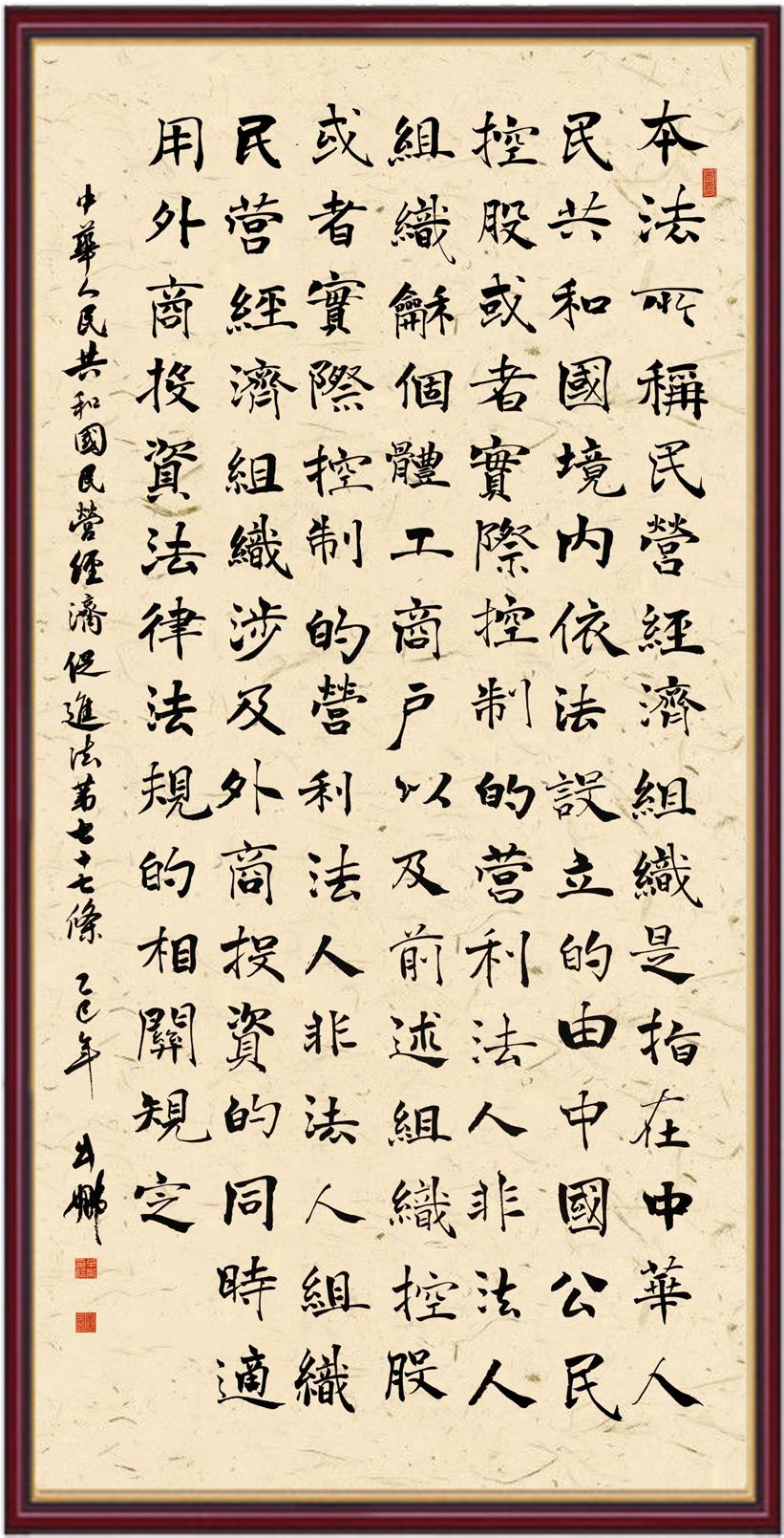 《中華人民共和國(guó)民營(yíng)經(jīng)濟(jì)促進(jìn)法》自今年5月20日起施行。作為我國(guó)首部專門關(guān)于民營(yíng)經(jīng)濟(jì)發(fā)展的基礎(chǔ)性法律,民營(yíng)經(jīng)濟(jì)促進(jìn)法將支持和保障民營(yíng)經(jīng)濟(jì)發(fā)展的法律制度融入中國(guó)特色社會(huì)主義法律體系,具有重大的法治意義,為促進(jìn)民營(yíng)經(jīng)濟(jì)持續(xù)、健康、高質(zhì)量發(fā)展提供了堅(jiān)實(shí)的法治保障。為更好地學(xué)習(xí)、宣傳、貫徹這部法律,法治日?qǐng)?bào)社聯(lián)合司法部普法與依法治理局,開展“‘書·法’系列活動(dòng)之書寫《中華人民共和國(guó)民營(yíng)經(jīng)濟(jì)促進(jìn)法》”活動(dòng)。