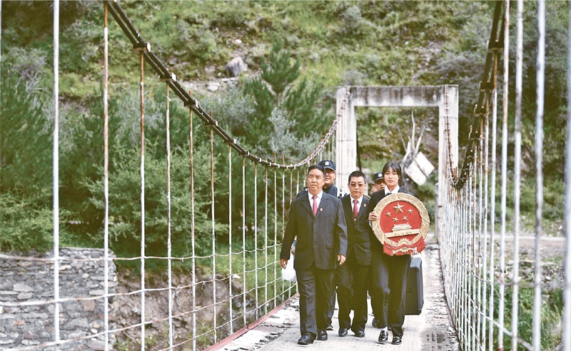 青海省果洛藏族自治州班瑪縣地處高原,山大溝深,群眾居住分散。近年來(lái),班瑪縣人民法院深入各鄉(xiāng)鎮(zhèn),將巡回法庭搬到森林、草原,在牧民家門(mén)口提供訴訟服務(wù),還通過(guò)以案說(shuō)法、模擬法庭等形式,開(kāi)展法律咨詢、法治宣傳。圖為2021年8月7日,班瑪縣人民法院巡回法庭成員前往燈塔鄉(xiāng)班前村提供法律服務(wù)?!⌒氯A社記者 張龍/攝