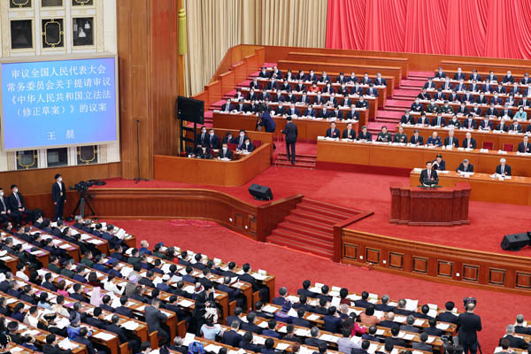 3月5日,第十三屆全國人大常委會副委員長王晨在第十四屆全國人民代表大會第一次會議上作關(guān)于《中華人民共和國立法法(修正草案)》的說明。新華社記者 龐興雷 攝