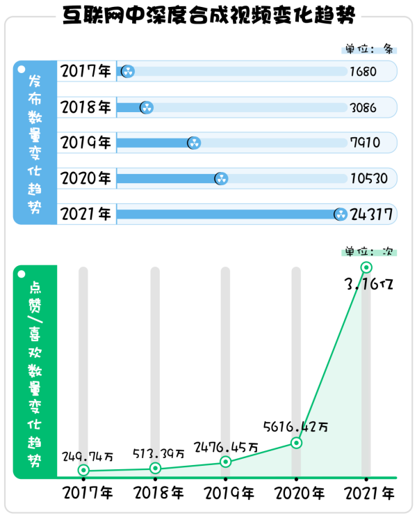 上一次人們感嘆人工智能的強(qiáng)大,還要追溯到2016年,阿爾法圍棋(AlphaGo)成為了第一個(gè)擊敗圍棋世界冠軍的人工智能機(jī)器人,深度學(xué)習(xí)的威力開始顯現(xiàn)。在此后的幾年,深度合成技術(shù)被廣泛應(yīng)用于各個(gè)領(lǐng)域。以互聯(lián)網(wǎng)中深度合成視頻為例,根據(jù)清華大學(xué)人工智能研究院聯(lián)合多家單位發(fā)布的《深度合成十大趨勢(shì)報(bào)告(2022)》顯示,近幾年,互聯(lián)網(wǎng)中深度合成視頻的發(fā)布與傳播數(shù)量呈現(xiàn)高速增長(zhǎng)的態(tài)勢(shì)。