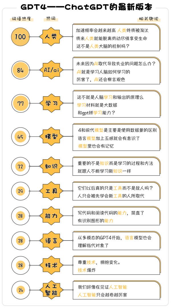(制作:法治網(wǎng)輿情中心 數(shù)據(jù)來源:在嗶哩嗶哩一則關(guān)于“GPT4會(huì)顛覆現(xiàn)有工作流”的視頻中,選取超過10000條彈幕及一級(jí)評(píng)論,對(duì)所選數(shù)據(jù)進(jìn)行NLP分析,將出現(xiàn)次數(shù)最多的詞語規(guī)定為100,以該詞語為基準(zhǔn)對(duì)其他熱詞進(jìn)行等尺度放縮,并選取每個(gè)熱詞對(duì)應(yīng)的輿論做可視化分析)