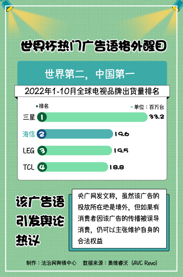 12.央廣網(wǎng):海信“世界第二”廣告引發(fā)爭議:機構稱真實銷量是第四名 律師認為消費者可維權
