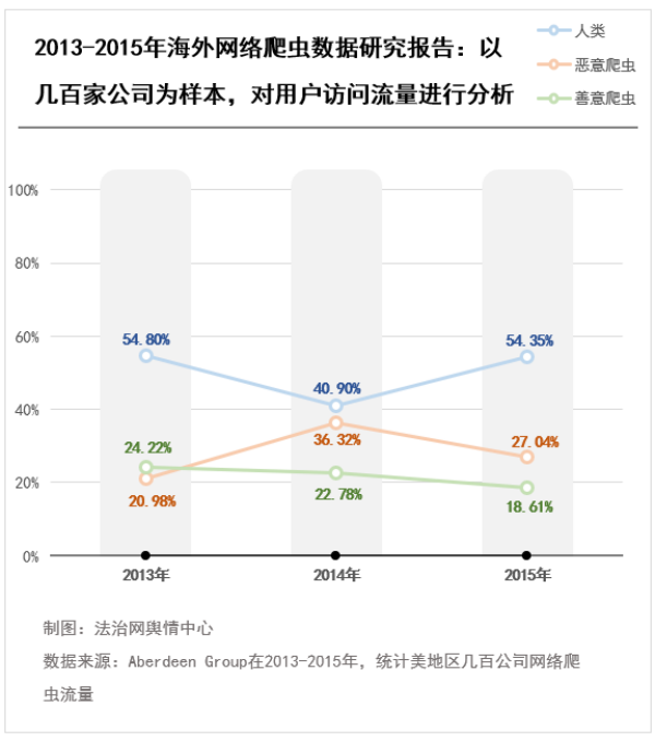 1.2013年—2015年:北美地區(qū)調(diào)查顯示網(wǎng)絡(luò)爬蟲流量占比約五成