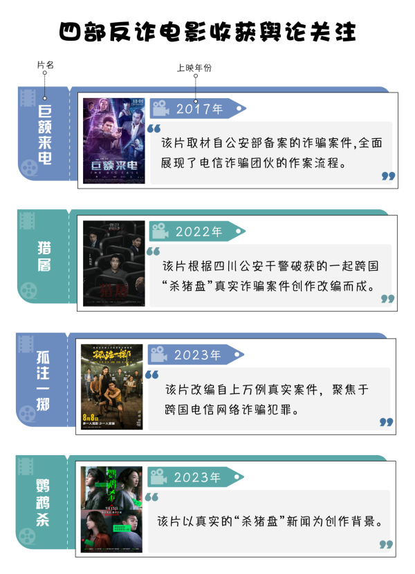 四部反電詐電影中,上映時(shí)間最早的是《巨額來(lái)電》,上映時(shí)間為2017年底,可以算作反電詐電影中的“前輩”。2022年5月10日,中宣部、公安部聯(lián)合啟動(dòng)“全民反詐在行動(dòng)”集中宣傳月活動(dòng),同年8月《獵屠》上映。2023年,公安機(jī)關(guān)對(duì)打擊電信網(wǎng)絡(luò)詐騙犯罪的力度不斷加大,宣傳力度隨之加強(qiáng),《孤注一擲》《鸚鵡殺》等兩部電影上映,引發(fā)輿論熱烈反響。以上四部電影均取材于真實(shí)案例,讓觀眾真實(shí)了解電信網(wǎng)絡(luò)詐騙的危害,進(jìn)而提升自身防范意識(shí)。