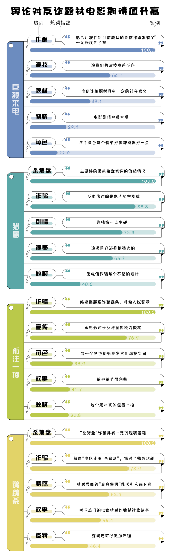 (制作:法治網(wǎng)輿情中心 數(shù)據(jù)來(lái)源:豆瓣 注:選取《巨額來(lái)電》《獵屠》《孤注一擲》《鸚鵡殺》等四部電影的部分豆瓣短評(píng),對(duì)所選取的短評(píng)做分詞處理,將頻度最高的詞語(yǔ)規(guī)定為100,對(duì)熱詞做歸一化處理)