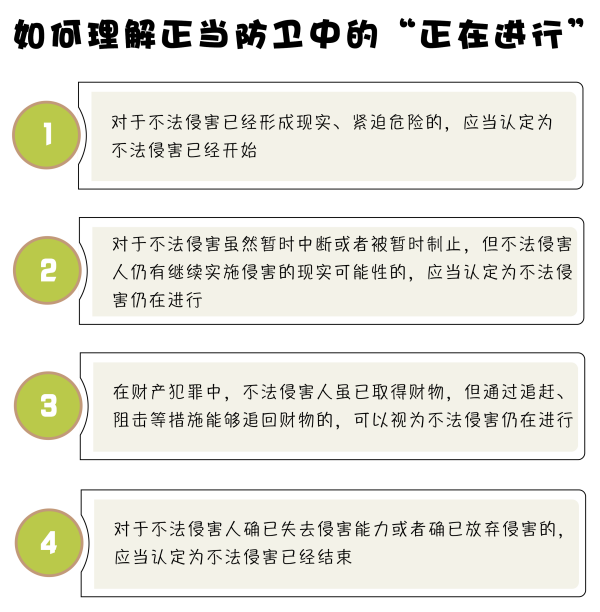 《檢察日報》在《〈第二十條〉法條解析:正當防衛(wèi)如何適用,法學專家、檢察官現(xiàn)身解答》一文中,針對法條中所要求的“正在進行”采訪了清華大學法學院教授張建偉,張建偉表示:“所謂‘正在進行’就是侵害行為已經(jīng)著手實施、尚未結束,侵害行為處于時間起點到終點的過程?!?/p>