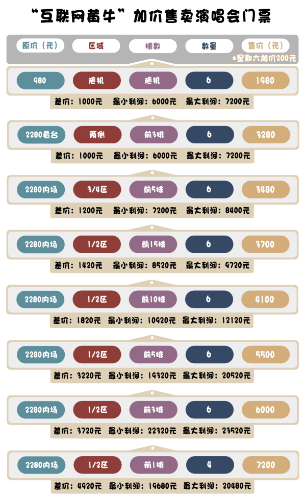 盡管如此,對(duì)于背后有二級(jí)資源的“互聯(lián)網(wǎng)黃?!眮碚f,售賣“黃牛”票并不是難事。以某位在廣東地區(qū)深受歡迎的歌手為例,其預(yù)計(jì)在今年11月舉行多場(chǎng)個(gè)人演唱會(huì),但有粉絲表示,演唱會(huì)的門票仍“一秒售罄”。某二手置物平臺(tái)數(shù)據(jù)顯示,演唱會(huì)門票并非全部售空,部分門票流入“互聯(lián)網(wǎng)黃?!敝?,原價(jià)為2280元的內(nèi)場(chǎng)票,因位置不同被炒至3280元至7200元不等。此外,若趕上演唱會(huì)在星期六舉辦,買家還需要額外支付200元的“熱門時(shí)段搶票費(fèi)用”。面對(duì)“一人一證”的入場(chǎng)機(jī)制,“互聯(lián)網(wǎng)黃?!钡纳馑坪醪⑽词艿接绊?。