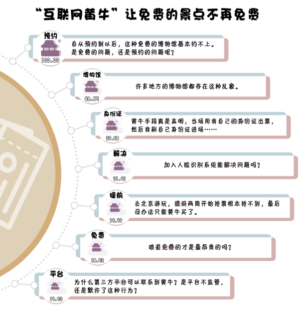 如此“作弊”手段引發(fā)輿論熱議。有網(wǎng)民表示,多地免費(fèi)景點(diǎn)都存在預(yù)約不上的現(xiàn)象,想去游玩必須花錢,其中博物館成“重災(zāi)區(qū)”;有網(wǎng)民感嘆“互聯(lián)網(wǎng)黃?!笔侄沃呙髁钊瞬坏貌环?,其已經(jīng)默許了“互聯(lián)網(wǎng)黃?!爆F(xiàn)象;部分網(wǎng)民反映,某些第三方平臺(tái)上,免費(fèi)預(yù)約門票被裹上“講解服務(wù)”“研學(xué)套餐”等外衣,搖身一變成為貨架上的商品,不禁令人發(fā)問,“互聯(lián)網(wǎng)黃?!睘楹慰梢悦髂繌埬懙卦诘谌狡脚_(tái)上售賣免費(fèi)預(yù)約門票?是官方平臺(tái)監(jiān)管不力、置之不理,還是其授意“互聯(lián)網(wǎng)黃牛”與第三方平臺(tái)相互串通謀取利益?