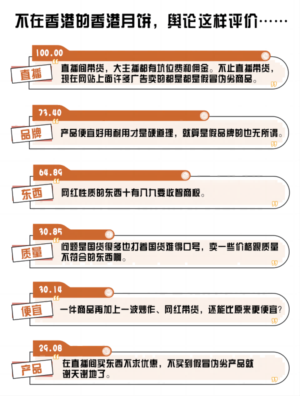 “香港美誠月餅”事件引發(fā)網(wǎng)民圍觀,有網(wǎng)民評論稱,售賣假冒偽劣商品現(xiàn)象不止存在于直播帶貨中,某些網(wǎng)站的廣告也是虛假廣告,二者的共同點是:有錢掙就行,質(zhì)量無需把關(guān);有網(wǎng)民表示,在直播間買東西不求有多優(yōu)惠,只求商品保真,但這一觀點也遭到了質(zhì)疑,有網(wǎng)民認(rèn)為這跟某些主播宣稱為廣大粉絲“把價格打下來”“謀福利”的口號相去甚遠(yuǎn),消費(fèi)者不應(yīng)該“退而求其次”;還有網(wǎng)民認(rèn)為,哪兒生產(chǎn)的不重要,牌子也不重要,貨真價實才最重要。
