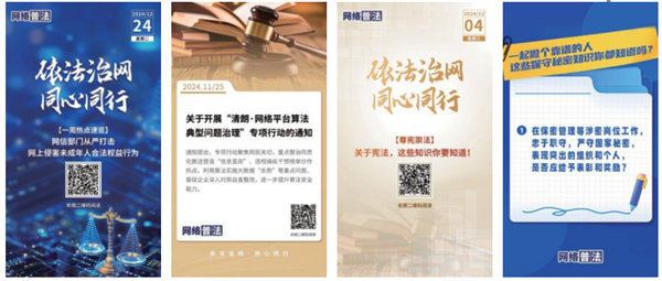 一是做好權(quán)威推送和重點(diǎn)報道。賬號及時準(zhǔn)確地發(fā)布網(wǎng)絡(luò)法治領(lǐng)域的重要報道、工作部署及法治宣傳實(shí)踐成果。及時關(guān)注網(wǎng)絡(luò)法治要聞,推出《網(wǎng)絡(luò)法治保障高質(zhì)量發(fā)展新聞發(fā)布會在京舉行》等報道;圍繞《中國網(wǎng)絡(luò)法治三十年》報告推出《一圖讀懂:網(wǎng)絡(luò)法治這樣保障高質(zhì)量發(fā)展》等權(quán)威解讀原創(chuàng)產(chǎn)品12期,多篇獲全網(wǎng)推送及地方網(wǎng)信媒體轉(zhuǎn)載。
