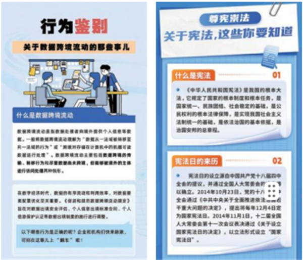 圍繞重點(diǎn)法規(guī)、重要時間節(jié)點(diǎn),做好權(quán)威內(nèi)容轉(zhuǎn)化,推出多形式的法宣產(chǎn)品、交互活動,從單向式教育向互動式、服務(wù)式、場景式傳播轉(zhuǎn)變。
