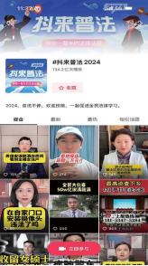 抖音“抖來(lái)普法”系列活動(dòng),年度話(huà)題播放量超百億,頭部法律作者對(duì)活動(dòng)的參與率高達(dá)95%,最高法、最高檢等公檢法司政務(wù)機(jī)構(gòu)也積極參與。截至2024年12月,#抖來(lái)普法2024年度長(zhǎng)線(xiàn)普法系列活動(dòng),播放量134.2億次,共計(jì)上萬(wàn)名法律創(chuàng)作者發(fā)布相關(guān)內(nèi)容。系列活動(dòng)如下:
