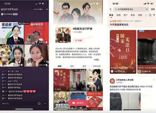 五是憲法日系列子話(huà)題持續(xù)推高活動(dòng)宣傳聲量。平臺(tái)邀請(qǐng)政法系統(tǒng)政務(wù)號(hào)、媒體、律師、學(xué)者參與#我是憲法守護(hù)者話(huà)題活動(dòng),截至目前話(huà)題累計(jì)播放量超1.5億;策劃#今天是國(guó)家憲法日#憲法的溫度#憲法日的由來(lái)#揭秘最高法憲法開(kāi)放日現(xiàn)場(chǎng)#香港海關(guān)慶祝國(guó)家憲法日10周年#香港國(guó)家憲法日升旗儀式等6個(gè)熱點(diǎn),其中#今天是國(guó)家憲法日登上抖音熱搜TOP3。
