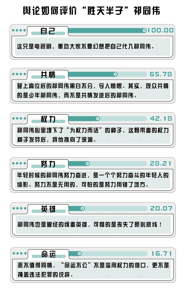 分析輿論發(fā)現(xiàn),身居高位的祁同偉濫用權(quán)力、違法亂紀(jì),令人不齒,但年少時(shí)期的祁同偉引發(fā)觀眾共情。他通過自身努力考入心儀的大學(xué),更是在參加工作后扎根一線,成為緝毒英雄。但隨著劇情的深入,祁同偉的心態(tài)發(fā)生改變,對(duì)權(quán)力的過度追求推他墜入深淵。有網(wǎng)民評(píng)論稱,祁同偉一定程度上代表了奮斗的普通人們,但他選擇了一條不歸路,也就此葬送了自己的命運(yùn);也有網(wǎng)民呼吁大家理性觀劇,不要將劇中的人物、情節(jié)過度代入到自己身上,電視劇與現(xiàn)實(shí)是有差別的,遠(yuǎn)離犯罪、遵紀(jì)守法才是正道。