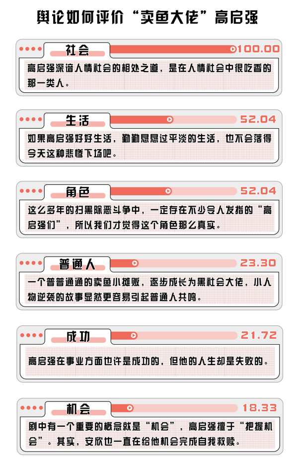 (制作:法治網(wǎng)輿情中心 數(shù)據(jù)來源:收集知乎問題“如何評(píng)價(jià)《狂飆》中張頌文飾演的高啟強(qiáng)?”下的384個(gè)回答,對(duì)選取的回答進(jìn)行數(shù)據(jù)清洗及自然語言處理,將熱度最高的詞語規(guī)定為100,并舉例子)