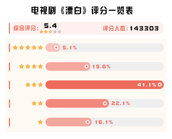 作為開年熱播劇,《漂白》的豆瓣評(píng)分從最初的6分降為5.4分。在參與評(píng)分的14萬余名觀眾中,41.1%的觀眾給出了三星,僅5.1%的觀眾給出了五星好評(píng)。跌破“及格線”的成績似乎并不理想,其中一個(gè)重要原因是該劇被指“過度美化反派”。