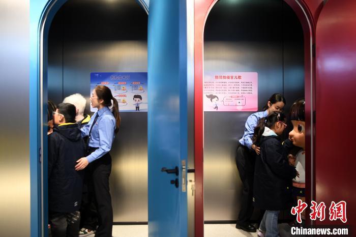 4月2日,在全國首個無障礙青少年法治教育基地,工作人員陪伴孩子在防范性侵展區(qū)了解相關(guān)知識。通過“人體紅綠燈”互動展項(xiàng),可以增強(qiáng)孩子的自我保護(hù)意識。牛宏超供圖