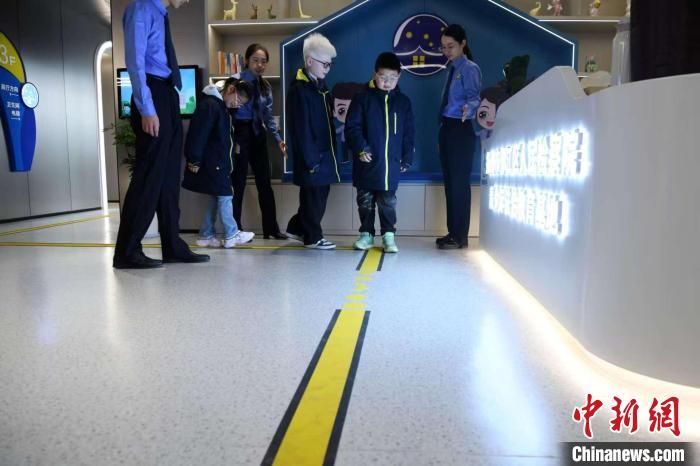 4月2日,在全國首個無障礙青少年法治教育基地,孩子們體驗(yàn)室內(nèi)盲道。牛宏超供圖