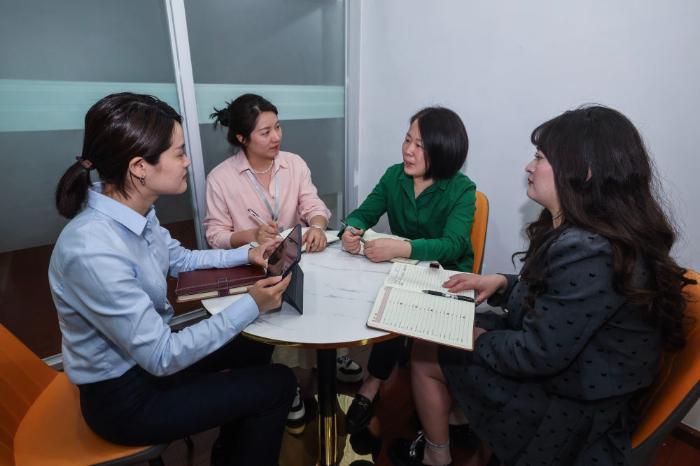 2025年4月17日,在浙江星程吉月智能科技有限公司,浙江杭州市富陽經濟技術開發(fā)區(qū)助企服務專員(左二)、富陽農商銀行工作人員(左一)上門解決企業(yè)融資需求。新華社記者 徐昱 攝