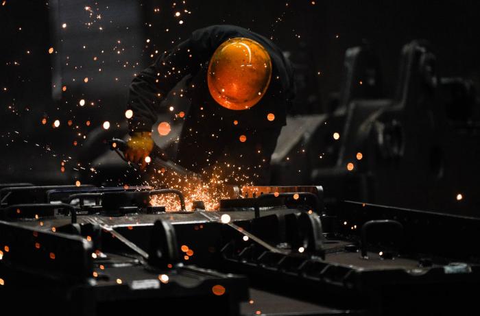 2025年3月19日,在河南省林州市紅旗渠經濟技術開發(fā)區(qū),工人在林州重機集團股份有限公司的鉚焊車間進行打磨作業(yè)。新華社記者 樊雨晴 攝