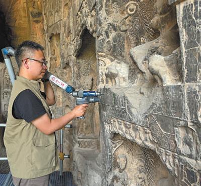 龍門(mén)石窟研究院的工作人員對(duì)石窟造像進(jìn)行數(shù)字化掃描。本報(bào)記者 張文豪攝