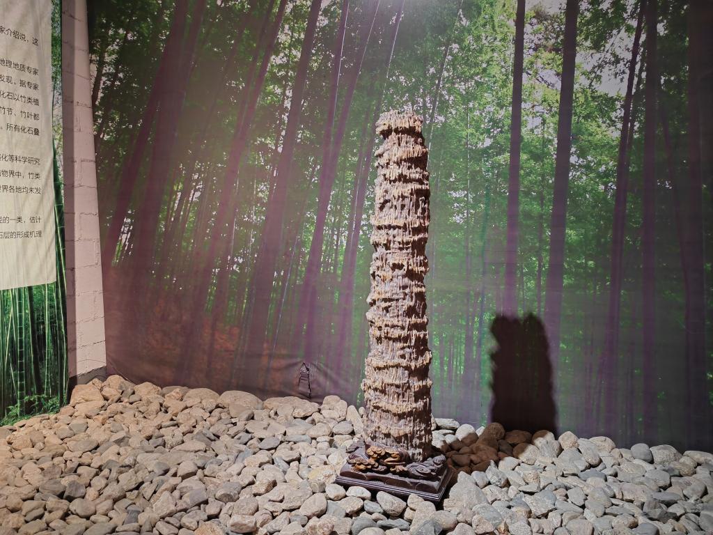 在原木標本展廳,一塊跨越萬年時光的竹化石靜靜陳列。燈光下,竹竿依舊挺拔,竹節(jié)棱角分明,葉片脈絡(luò)甚至細胞纖維都清晰可辨。“這些木頭會說話,它們在講述地球的故事。”姜開峰說。