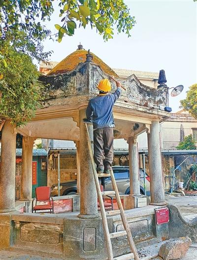 文物維修人員正在清理南朗街道濠涌村中山紀念亭的污垢。 江才松攝
