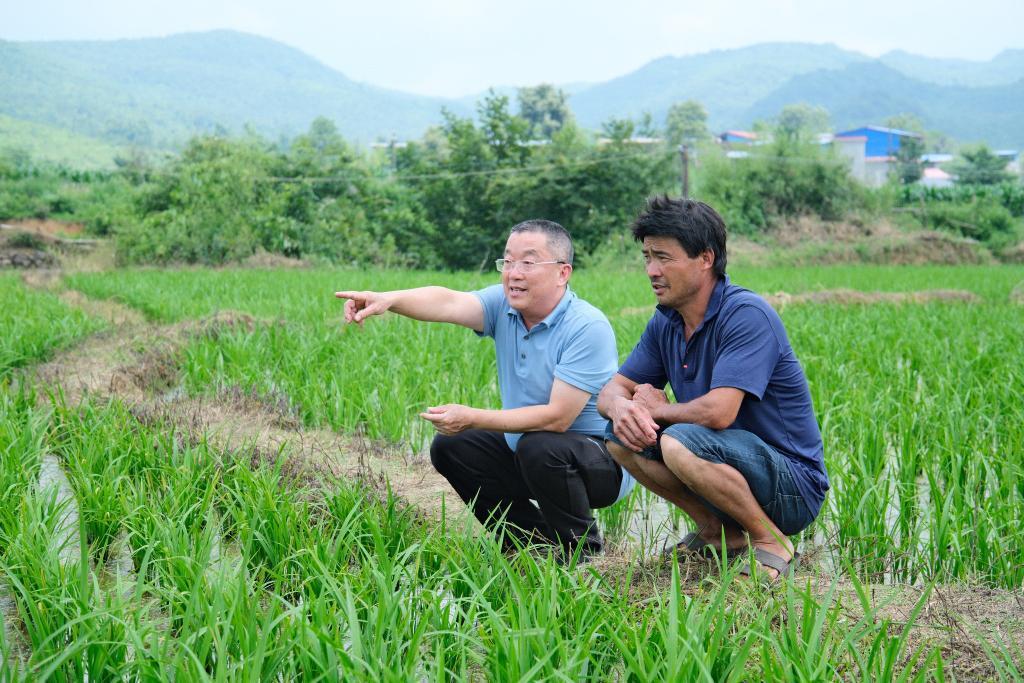 白竹村駐村第一書記莫日發(fā)(左)正在指導(dǎo)村民進行田間管理。新華社記者 鄒雨沁 攝