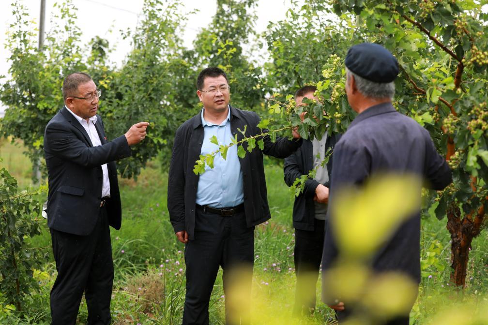 在富民新村的經(jīng)濟(jì)林栽植區(qū),古浪縣委組織部常務(wù)副部長(zhǎng)俞永文(左二)與富民新村黨委書(shū)記兼村委會(huì)主任張延堂(左一)在和種植戶(hù)交流。新華社記者 郭剛 攝