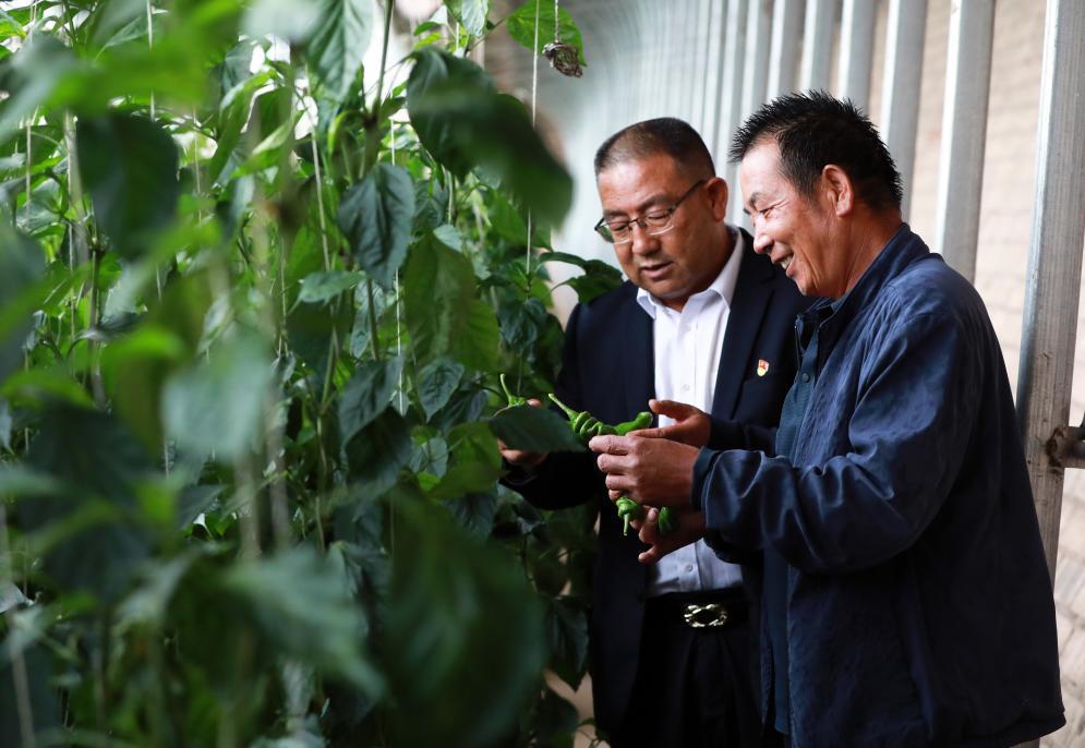 在富民新村種植區(qū)的日光溫室內(nèi),富民新村黨委書(shū)記兼村委會(huì)主任張延堂(左)在與種植戶(hù)何振田查看辣椒長(zhǎng)勢(shì)。新華社記者 郭剛 攝