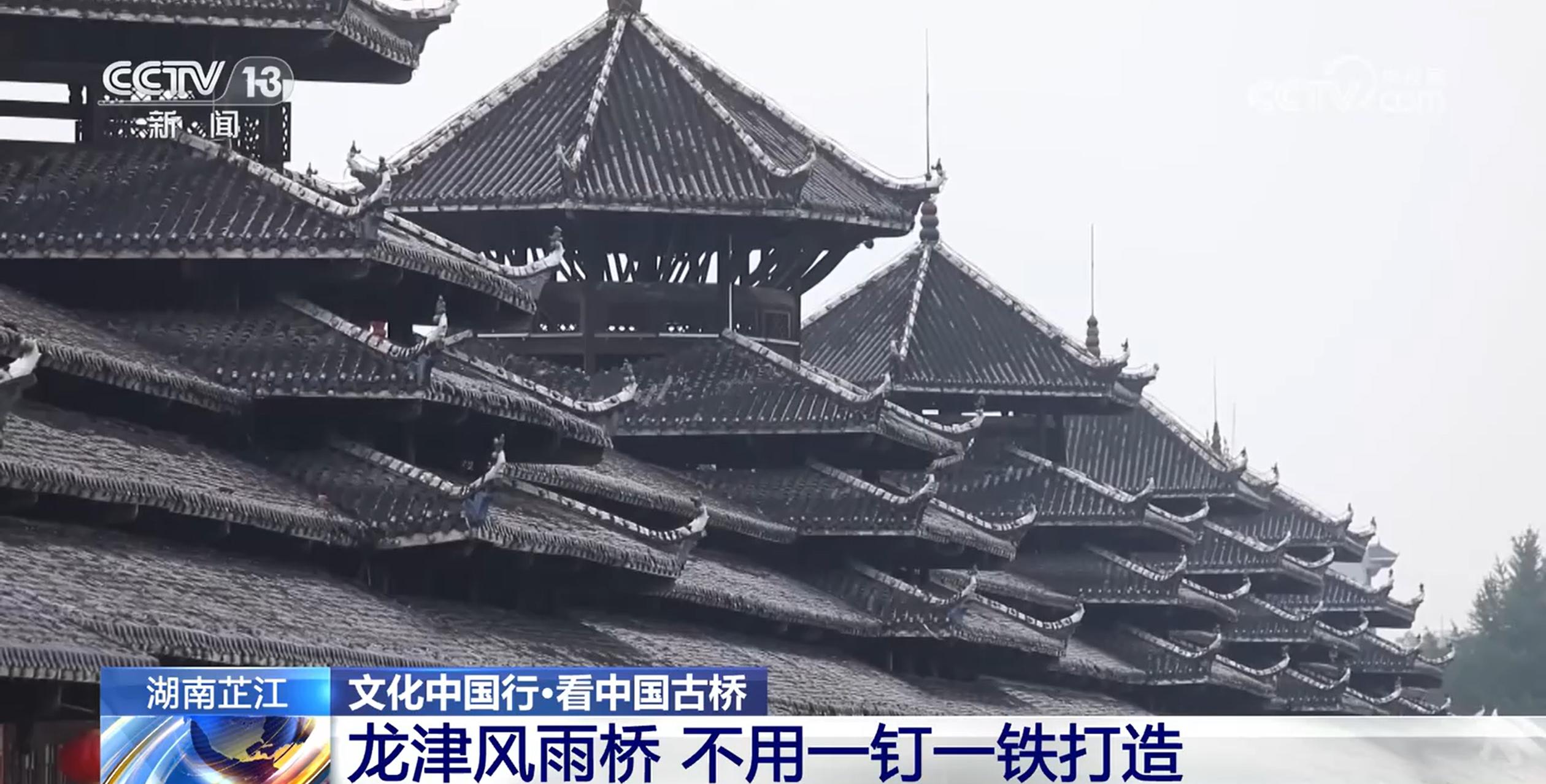 跟隨無人機的視角穿過湖南芷江,龍津風雨橋如一條巨龍橫跨?水河,它全長246.7米、寬12.2米。這座風雨橋橋墩形似“龍口噴津”,龍津橋因此而得名。龍津橋上,三重檐的廊道與五重檐的亭閣錯落有致,深藍色琉璃瓦與白色檐口相映成趣。