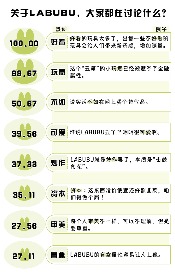 (數(shù)據(jù)來源:選取嗶哩嗶哩視頻《“丑東西”LABUBU,憑什么能讓全球富婆們上癮?》下的2976條一級評論及彈幕,做分詞及歸一化處理,進(jìn)行分詞后將熱度最高的詞語規(guī)定為100)