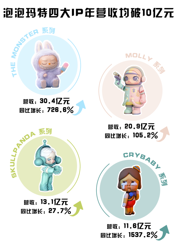 2025年4月,泡泡瑪特發(fā)布2024年報。報告顯示,2024年泡泡瑪特營收約130.4億元。其中,四大IP“THE MONSTERS”“MOLLY”“SKULLPANDA”“CRYBABY”的營收均突破10億元。LABUBU所屬的“THE MONSTERS”系列更是以30.4億元的營收額,726.6%的同比增幅,當(dāng)之無愧成為泡泡瑪特旗下的第一IP。