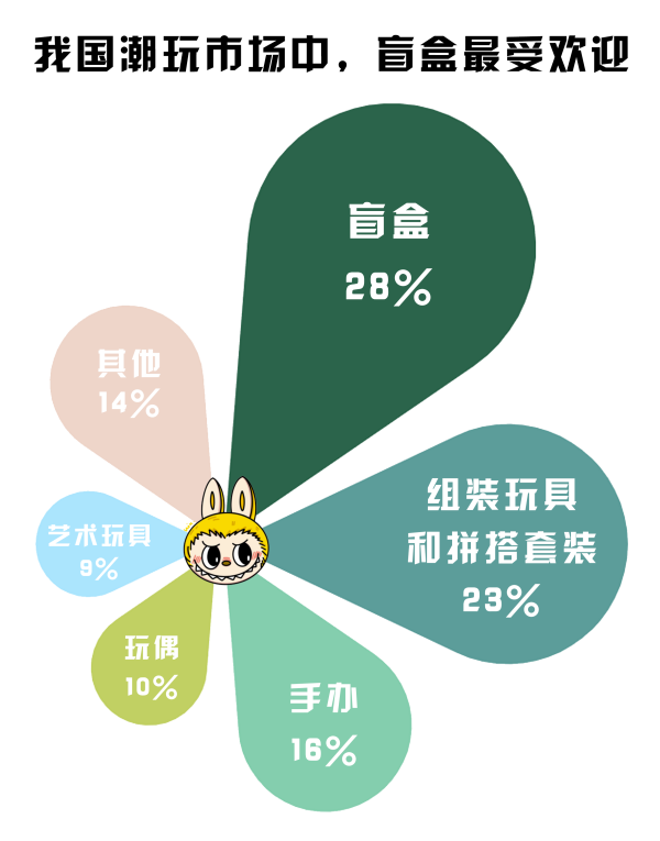 盲盒屬性為消費者提供情緒價值。數(shù)據(jù)顯示,我國潮玩市場中,盲盒是最大的細(xì)分市場,占比約28%。